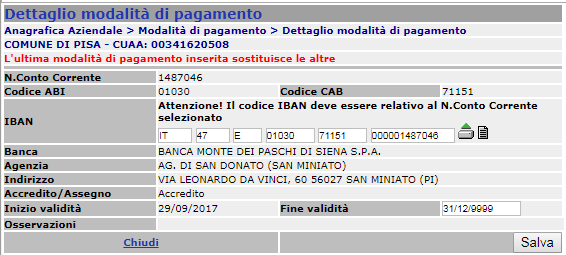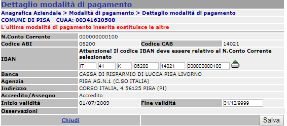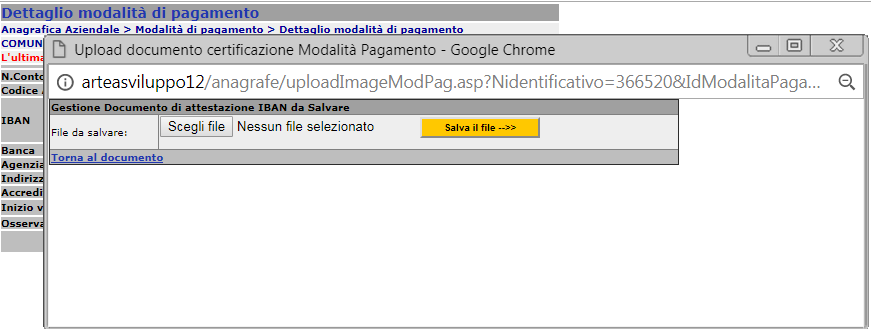 3) Ogni modalità di pagamento che viene inserita nel sistema dovrà recare un file di attestazione dal quale risulta che l’IBAN è intestato al beneficiario del premio o contributo; nessun IBAN, quindi, può essere inserito senza la relativa documentazione a supporto.
