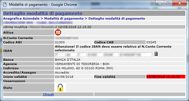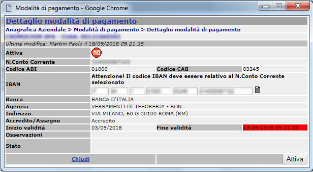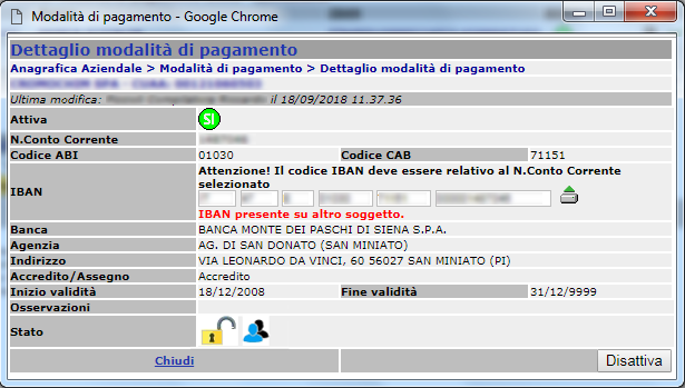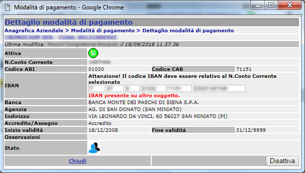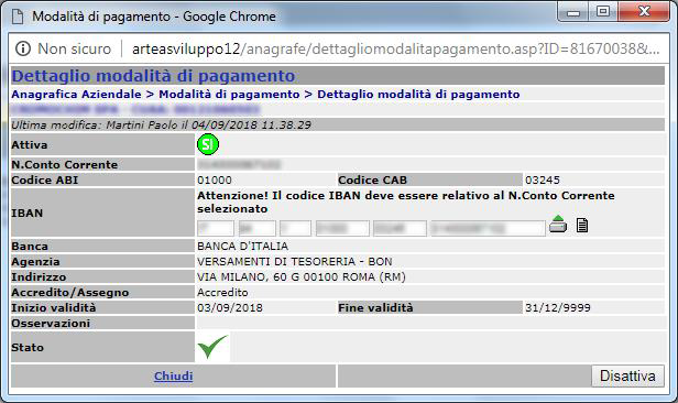 7) Le modalità di pagamento presenti sui beneficiari possono essere ripristinate o disattivate attraverso le funzioni di “Attiva” e “Disattiva” (non sarà più presente la funzione di modifica “fine validità”), evitando così la duplicazione delle stesse e per fare in modo che resti traccia di tutte le modifiche intercorse. Nella maschera di dettaglio è visibile una icona che indica se la modalità è attiva o disattiva.